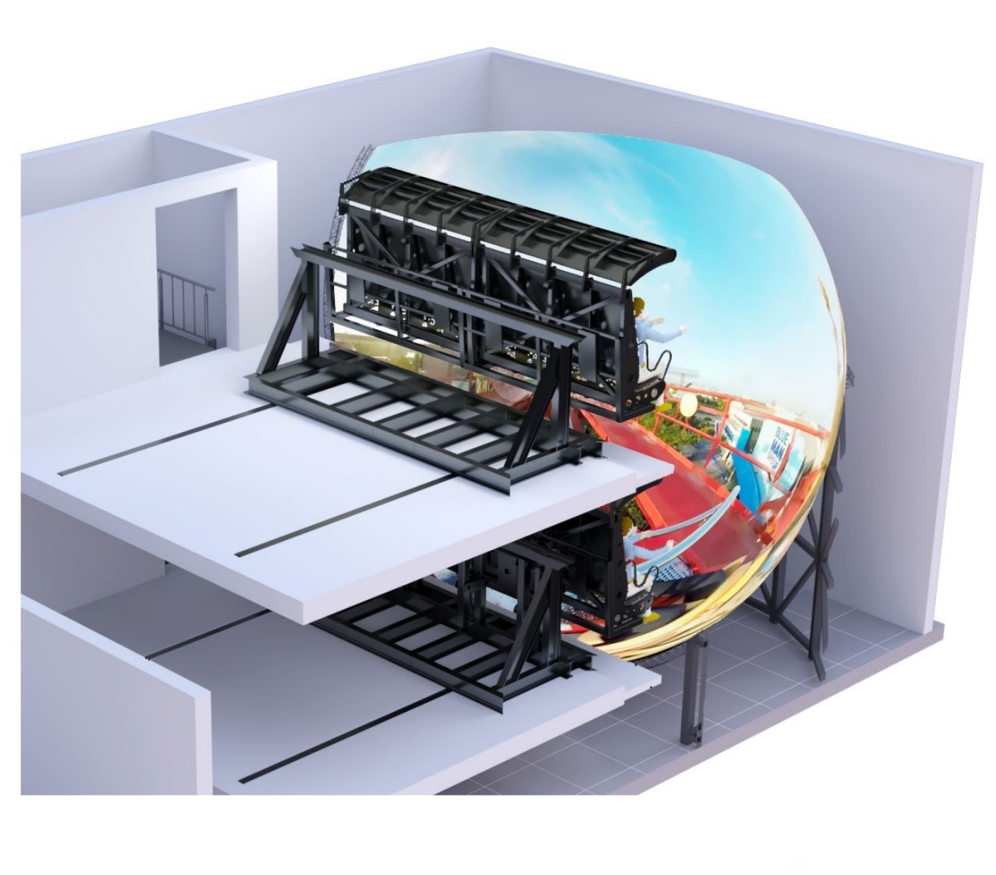 产品配置:投影机-4台,6000流明;音响-立体声;飞行平台-旋转式背挂6自由度